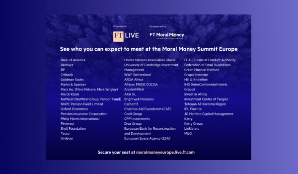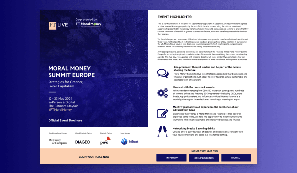 Here at FT Live, we understand the importance of meeting face-to-face with your peers and we are delighted to be again holding this year’s Moral Money Summit Europe in person, providing a unique opportunity to mix with your peers, at one of the most important events in the FT Live calendar.